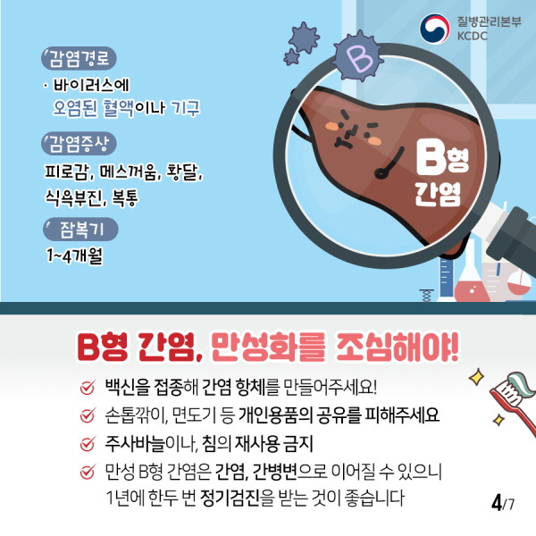 4. 정기적인 건강 검진 : B형 간염 감염 여부를 확인하기 위해 정기적으로 검진을 받는 것이 좋아요.