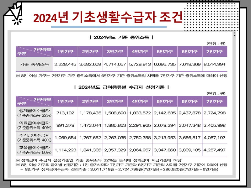 태그 : #기초생활수급자 #2024년 #사회복지 #생계급여 #의료급여 #주거급여 #교육급여 #복지정보