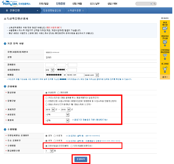 2. 신청서 작성 : 소득금액증명원 신청서를 작성합니다.