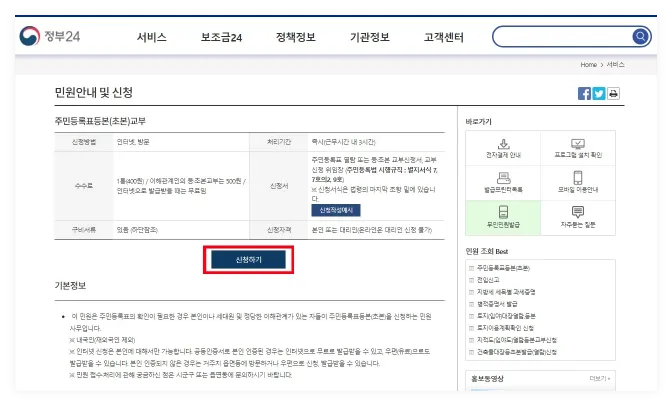 3. 민원안내 및 신청 메뉴에서 주민등록등본을 선택합니다.