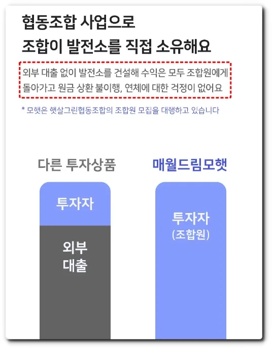 모햇 투자는 태양광 발전을 기반으로 한 협동조합 형태의 투자 모델입니다. 투자자들은 태양광 발전소에 직접 투자하여 발생하는 수익을 나누는 구조로 되어 있습니다. 이 모델은 특히 환경 친화적인 에너지 생산 방식으로 주목받고 있으며, 많은 사람들이 이 투자에 관심을 가지게 된 이유 중 하나입니다.