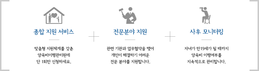 2. 사후 모니터링 : 양육비 지급이 이루어질 때까지 지속적으로 모니터링하며, 필요한 경우 추가 지원을 제공합니다. 이 지원은 자녀가 19세가 될 때까지 계속됩니다.