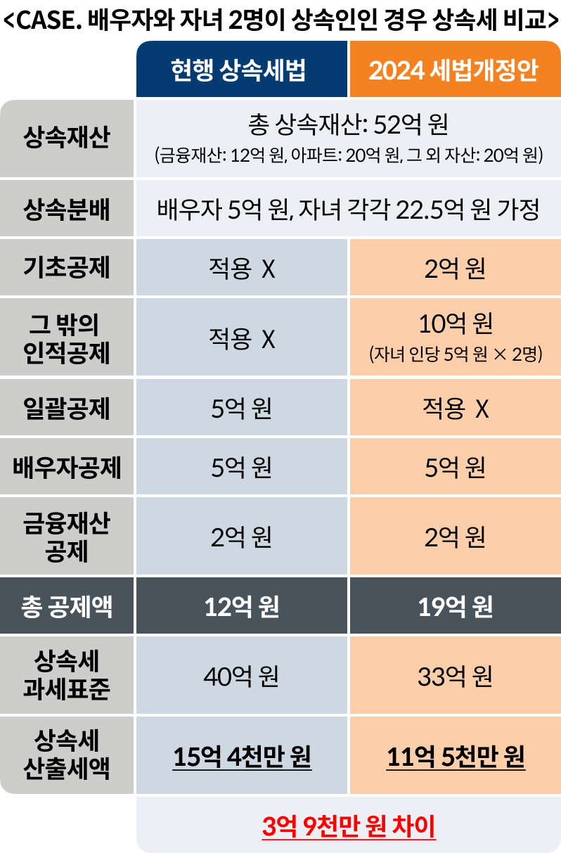 상속세 계산을 통해 개정안의 효과를 살펴보겠습니다. 예를 들어, 총 상속 자산이 52억 원인 경우, 배우자와 두 자녀에게 상속하는 경우를 가정해 보겠습니다.