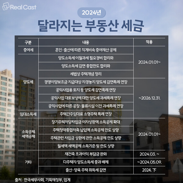 2024년에는 부동산 세금에 대한 여러 가지 변화가 예정되어 있습니다. 특히, 종합부동산세, 양도소득세, 임대소득세 등 주요 세금 항목에서 변화가 있을 예정입니다. 이러한 변화는 부동산 소유자와 투자자에게 큰 영향을 미칠 것으로 예상됩니다.
