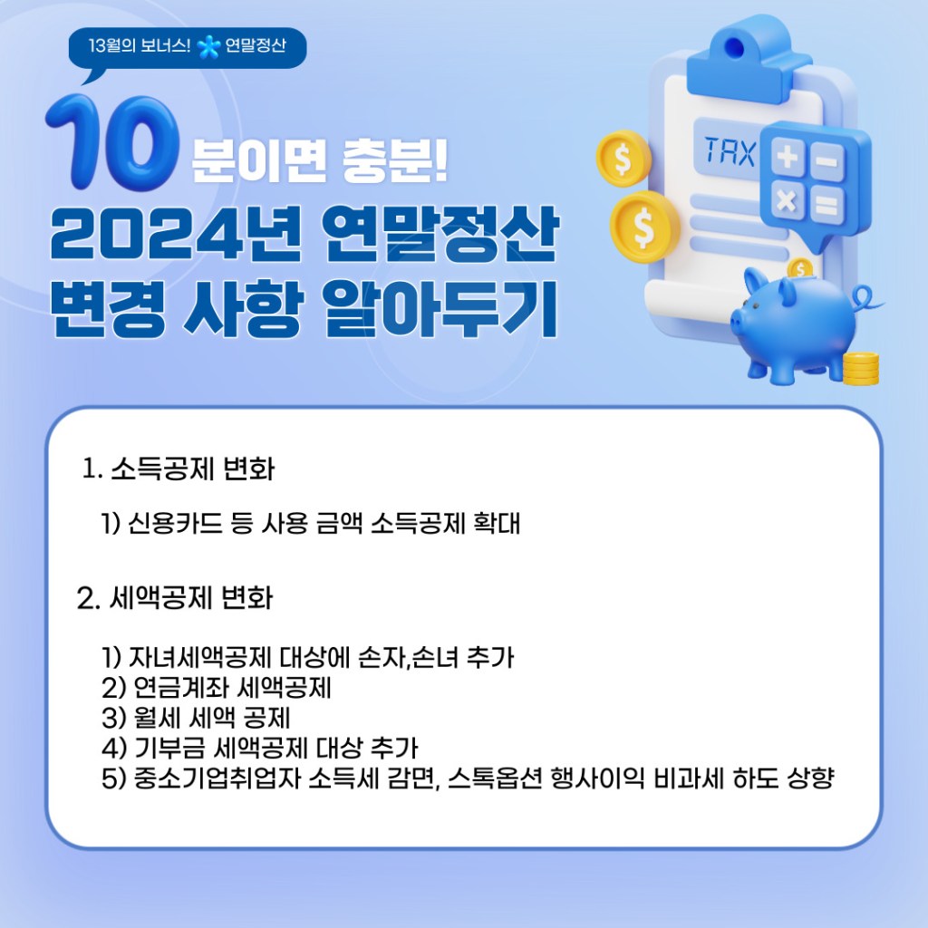 #연말정산 #세액공제 #소득공제 #2024연말정산 #세법변경 #신용카드공제 #자녀세액공제 #의료비공제 #교육비공제 #재정계획