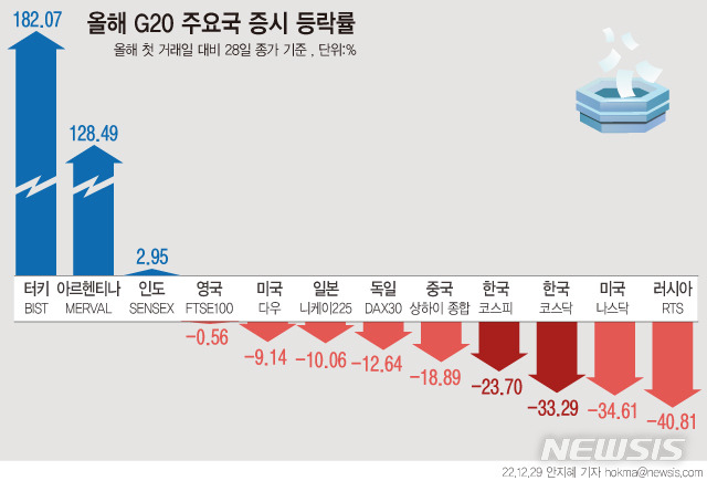 하지만, 한국의 KOSPI와 KOSDAQ은 각각 34.61%와 33.29%의 큰 하락폭을 보였습니다. 이는 글로벌 경제 불확실성과 금리 인상 등의 요인이 복합적으로 작용한 결과로 분석됩니다.