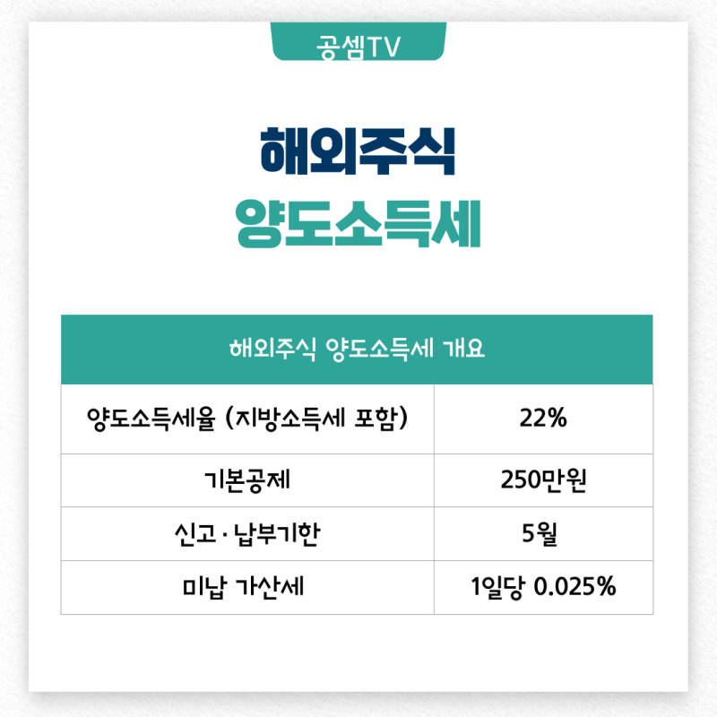 해외주식의 양도소득세는 주식 매도 시 발생하는 세금으로, 현재 세율은 22%입니다. 하지만, 기본공제 금액인 250만 원을 초과하는 이익에 대해서만 세금이 부과됩니다. 즉, 손실과 이익을 모두 합산한 후 기본공제를 적용한 금액에 대해 세금이 부과되는 것입니다.