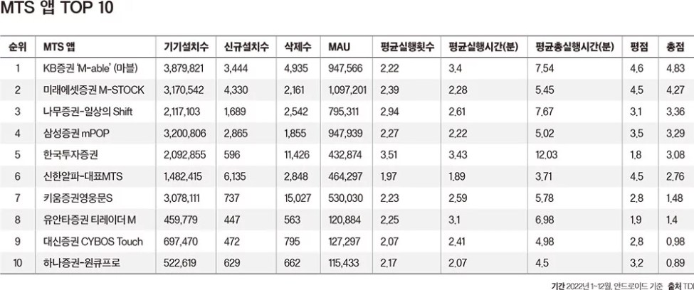 해외주식 거래를 위한 MTS(모바일 거래 시스템) 앱도 중요한 요소입니다. 아래의 표는 국내에서 인기 있는 MTS 앱의 성능을 비교한 것입니다.
