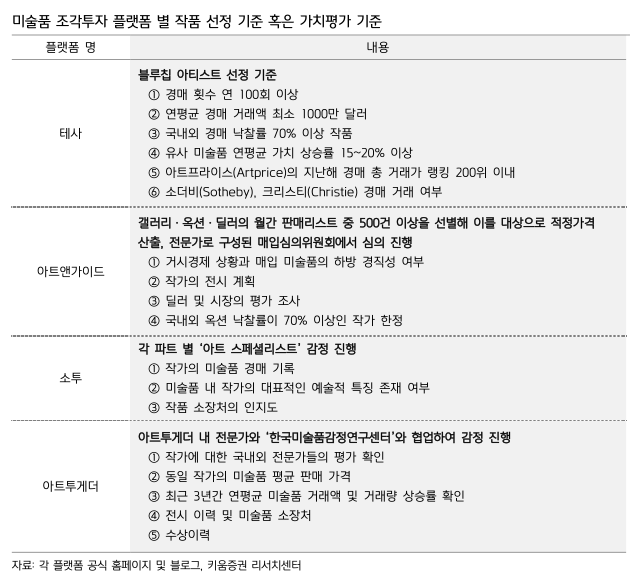 미술품 선택 기준을 정리한 표입니다. 각 플랫폼의 요구 사항을 비교할 수 있습니다.