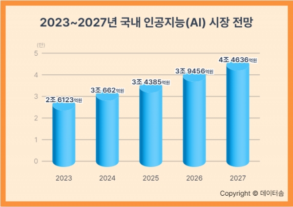 한국의 AI 시장도 예외는 아닙니다. 2023년부터 2027년까지의 예측에 따르면, AI 시장 규모는 매년 증가하여 2027년에는 약 4.46조 원에 이를 것으로 보입니다. 이는 기업들이 AI 기술을 도입하여 생산성을 높이고, 새로운 비즈니스 모델을 창출하는 데 집중하고 있음을 보여줍니다.