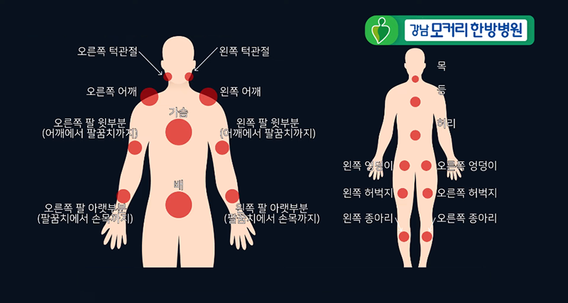 • 전신 통증 : 몸의 여러 부위에서 느껴지는 지속적인 통증이 특징입니다. 특히 목, 어깨, 허리, 엉덩이, 무릎 등에서 통증이 자주 발생합니다.