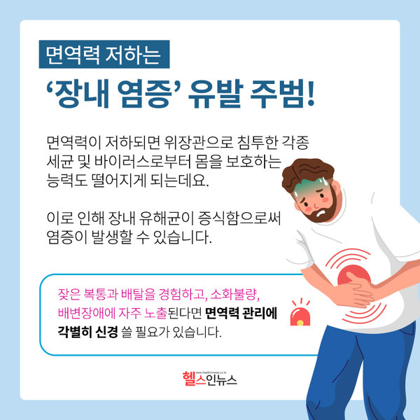 2. 소화기 증상 : 면역력이 약해지면 장염과 같은 소화기 질환이 발생할 수 있습니다. 복통, 설사, 복부 팽만감 등의 증상이 나타날 수 있습니다.