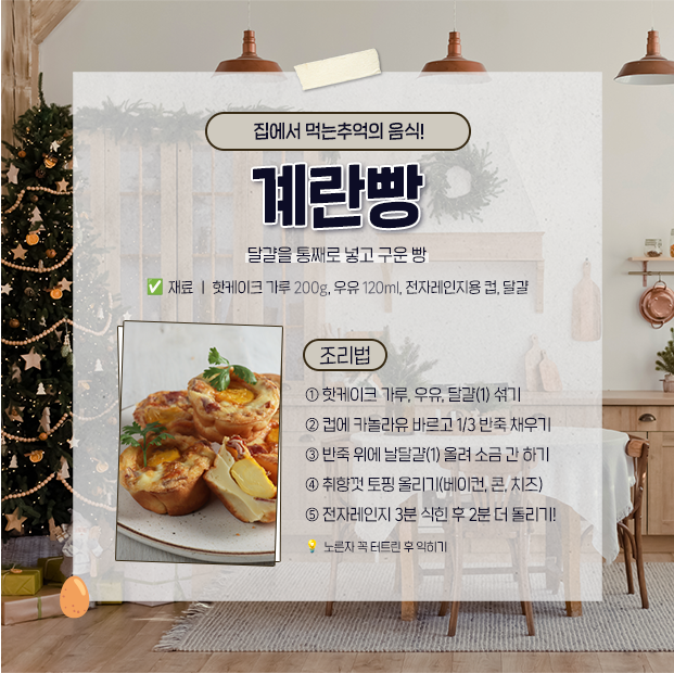 먼저 소개할 레시피는 겨울철 간식의 대표주자, 계란빵입니다. 간단한 재료로 만들 수 있는 이 간식은 누구나 쉽게 따라 할 수 있습니다.