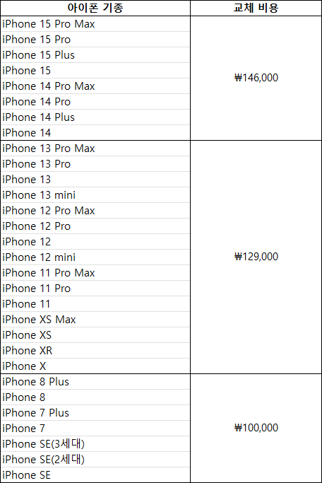 아이폰 모델에 따라 배터리 교체 비용이 다릅니다. 최신 모델일수록 교체 비용이 높아지며, 예를 들어 아이폰 14와 15 시리즈는 ₩146,000입니다. 반면, 아이폰 7이나 SE 모델은 ₩100,000으로 상대적으로 저렴합니다. 아래의 표를 통해 각 모델별 교체 비용을 확인할 수 있습니다.