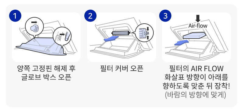 - 필터 커버 열기 : 필터 커버를 열고, 기존 필터를 꺼냅니다.
