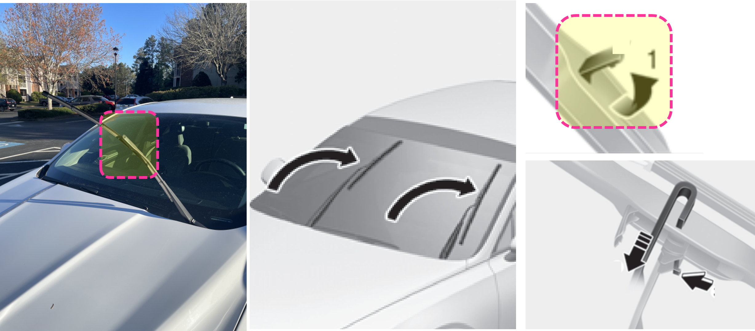 - 와이퍼 블레이드 분리 : 와이퍼 블레이드의 고정 장치를 눌러 블레이드를 분리합니다.