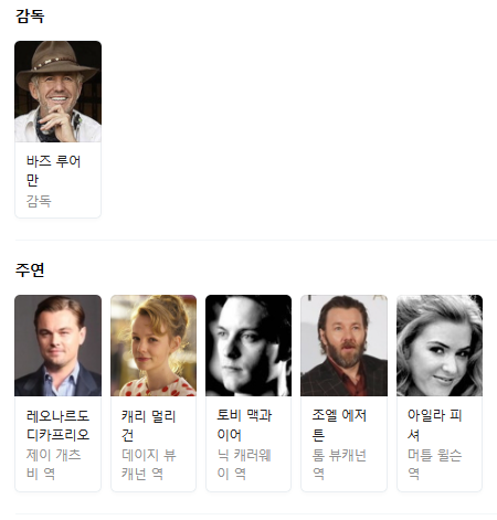 감독은 바즈루어만 이 맡았고 , 주연은 대한민국 누구나 알수 있는 레오나르도 디카프리오 , 캐리 멀리건 , 토비 맥과이어 , 조엘 에저튼 , 아일라 피셔 가 주연으로 연기를 합니다.