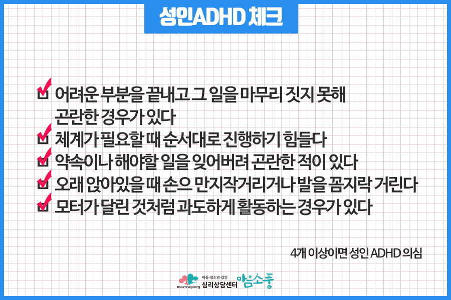 [1] 국가정신건강정보포털 - 인식개선정보 > 칼럼 > 성인 ADHD 원인과 치료방법 (https://www.mentalhealth.go.kr/portal/bbs/bbsDetail.do?bbsId=BBSINIT_2&nttId=249)