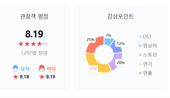 관람객 평점은 8.19 로 의외로 호불호가 있진 않는것으로 보입니다. 관람객들에 공통적인 리뷰들은 영화를 보면서 생각이 많아 진다고 얘기들이 많았습니다.