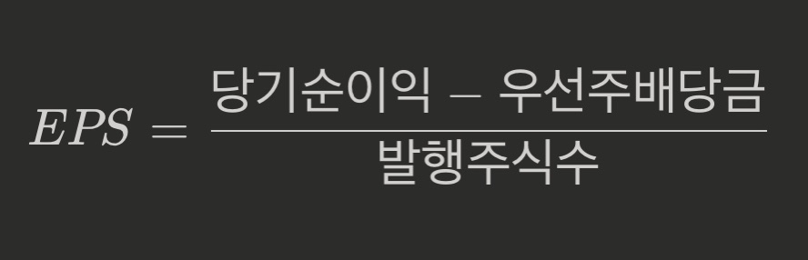 여기서 당기순이익은 기업이 일정 기간 동안 벌어들인 순이익을 의미하며, 우선주배당금은 우선주 주주에게 지급되는 배당금을 말합니다. 발행주식수는 기업이 발행한 총 주식의 수를 나타냅니다. 이 공식을 통해 EPS를 계산하면, 주주가 한 주당 얼마의 이익을 얻는지를 알 수 있습니다.