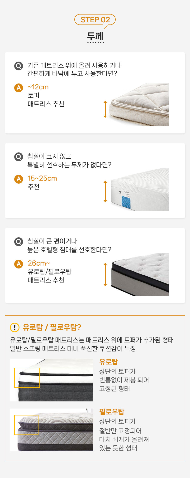 에서는 매트리스 두께에 따른 추천 사항을 제시하고 있습니다.
