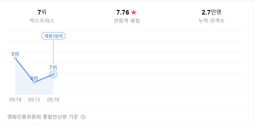 관람객 평점은 7.76 으로 평균 적인 평점이네요~ 누적 관객수는 2.7만명 으로 아직!! 더 힘을 내야 될꺼 같습니다.