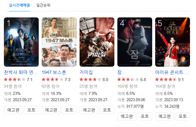 영화 예매 순위 , 화제의 기대작들 TOP 3  (0) 2023.09.14