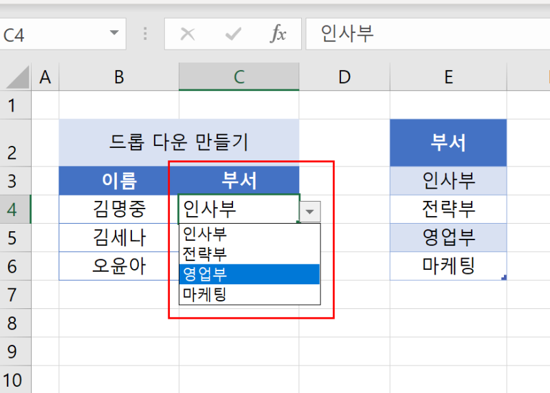 • 부서 선택 : 직원의 부서를 선택할 때, 드롭다운 목록을 통해 "인사부", "전략부", "영업부" 등의 옵션을 제공할 수 있습니다.