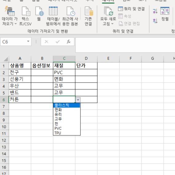 1. 목록 항목 준비 : 드롭다운 목록에 포함할 항목을 엑셀 시트의 한 열에 입력합니다. 예를 들어, "상품명" 아래에 "면화", "유리", "고무" 등의 재질을 입력할 수 있습니다.
