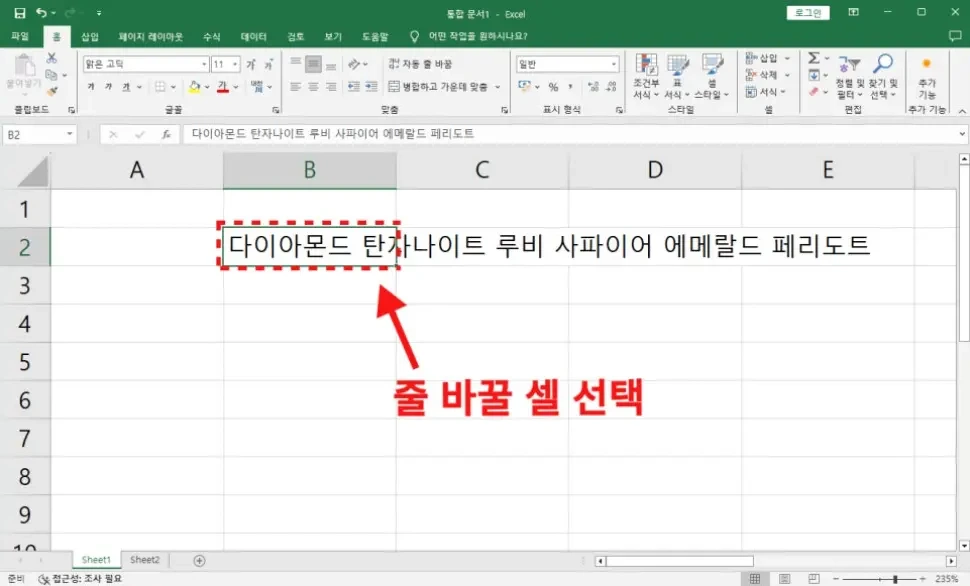 - 줄바꿈을 원하는 셀을 선택합니다.