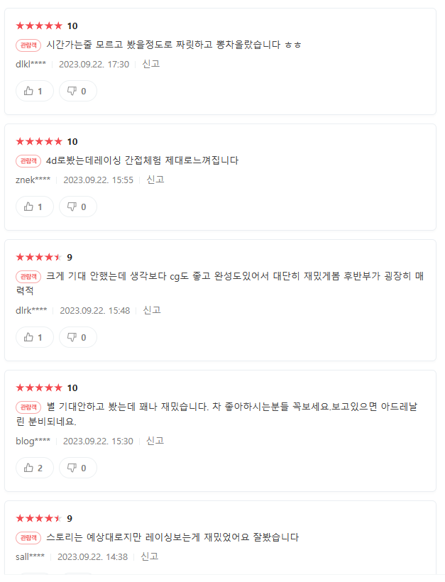 개인적인 생각으로 그란 투리스모 영화는 높아진 cg 수준 과 레이싱라는 주제에 영화라 사운드도 매우 만족스러운 영화 일꺼같습니다. 관람객 평점을 보면 7.82 이고 , 관람객 리뷰를 보면서 기대 없이 봤다가 시간 가는줄 모르고 봤다는 내용이 많았습니다.