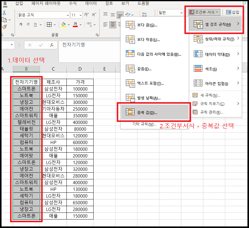 3. 조건부 서식을 이용한 중복값 강조