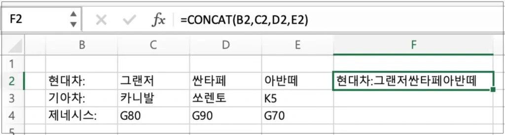 - CONCATENATE 함수 사용 예제 : =CONCATENATE(A1, ": ", B1, ", ", C1)을 사용하여 여러 제품을 나열할 수 있습니다.