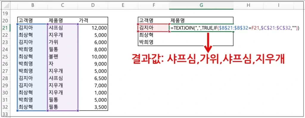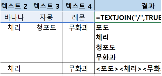 - TEXTJOIN 함수 사용 예제 : =TEXTJOIN(", ", TRUE, B1:D1)을 사용하여 B1부터 D1까지의 제품명을 쉼표로 구분하여 합칠 수 있습니다.