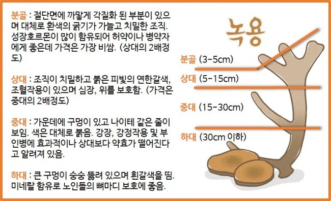 녹용은 사슴의 뿔에서 얻는 제품으로, 뿔의 다양한 부위에 따라 각각 다른 효능을 가지고 있습니다. 녹용은 보통 네 가지 부분으로 나누어 설명할 수 있습니다: