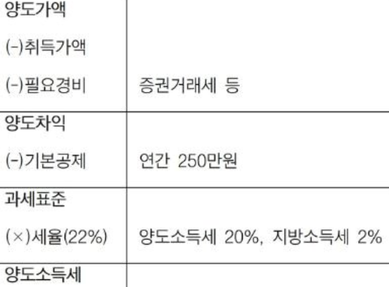 양도소득세는 다음과 같은 방식으로 계산됩니다. 먼저, 양도가액(주식을 매도한 가격)에서 취득가액(주식을 매입한 가격)과 필요경비(매매 수수료 등)를 차감하여 양도차익을 구합니다. 이때 기본공제액인 250만 원을 차감한 후, 과세표준에 대해 22%의 세율이 적용됩니다.