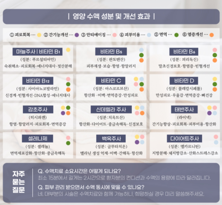 - 진통제 수액 : 두통이나 근육통 완화에 도움을 줍니다.