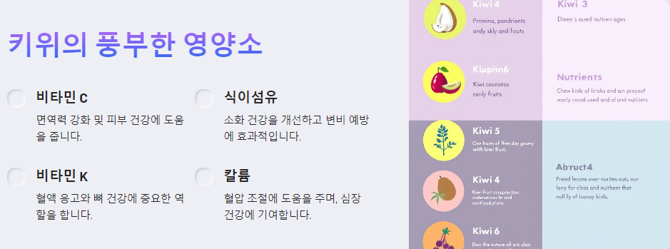 이러한 효능 덕분에 키위는 건강한 식단에 필수적인 과일로 자리 잡고 있습니다.