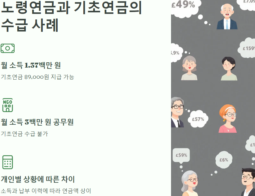 노령연금과 기초연금의 수급 사례를 살펴보면, 다양한 상황에서 어떻게 지급되는지를 알 수 있습니다. 예를 들어, 한 개인이 1.37백만 원의 월 소득을 가지고 있다면 기초연금은 89,000원이 지급될 수 있습니다. 반면, 3백만 원의 소득을 가진 공무원은 기초연금을 받을 수 없습니다.