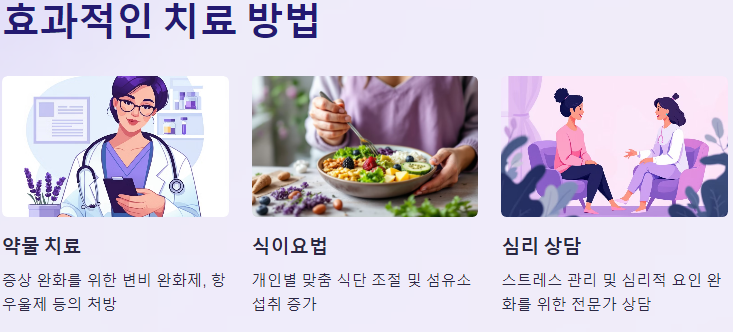 과민성 대장 증후군은 완치가 어렵지만, 증상을 관리하기 위한 다양한 치료 방법이 있습니다. 치료 방법으로는 다음과 같습니다: