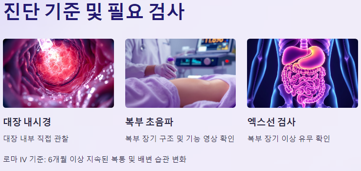 과민성 대장 증후군의 진단은 주로 환자의 증상과 병력을 기반으로 이루어집니다. 로마 IV 기준 에 따르면, 최소 6개월 이상 지속된 복통과 배변 습관의 변화가 있어야 진단할 수 있습니다. 추가적으로, 다른 질환을 배제하기 위해 다음과 같은 검사가 필요할 수 있습니다:
