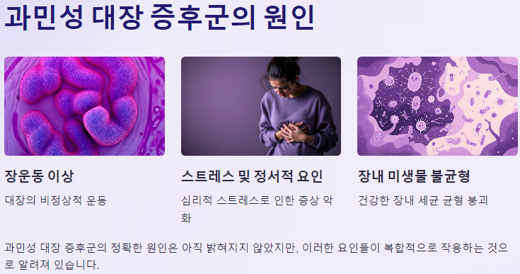 과민성 대장 증후군의 정확한 원인은 아직 밝혀지지 않았지만, 여러 가지 요인이 복합적으로 작용하는 것으로 알려져 있습니다. 주요 원인은 다음과 같습니다: