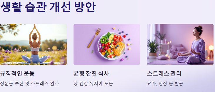 - 균형 잡힌 식사 : 건강한 식사를 통해 장 건강을 유지합니다.
