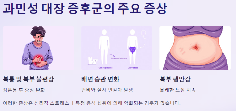 과민성 대장 증후군의 주요 증상은 다음과 같습니다:
