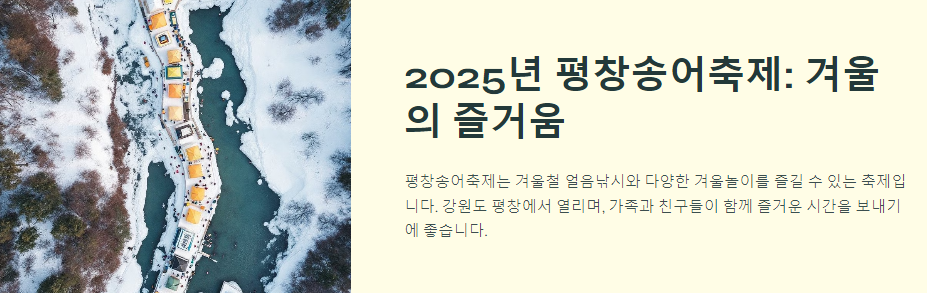 평창송어축제는 매년 겨울철에 열리는 특별한 행사로, 얼음낚시와 다양한 겨울놀이가 함께 어우러지는 축제입니다. 이 블로그 포스트에서는 2025년 평창송어축제에 대한 다양한 정보를 자세히 안내해 드리겠습니다.