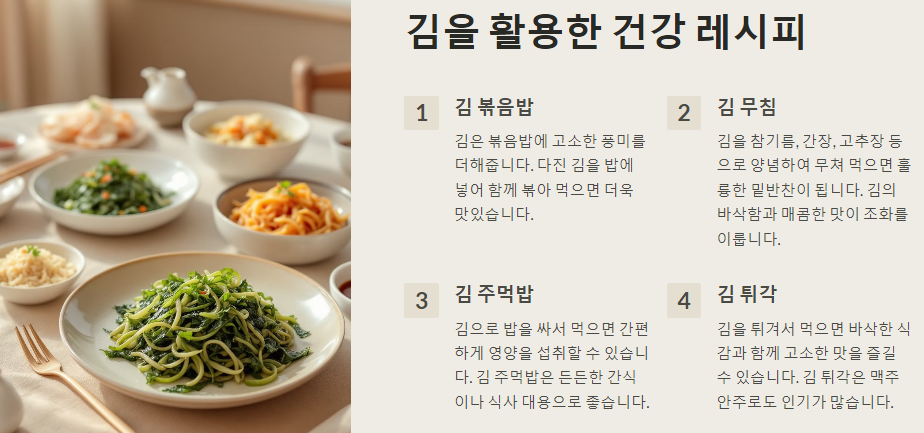 김국이나 김무침과 같은 요리로도 활용할 수 있으며, 간편하게 간식으로 즐길 수 있는 구운김이나 조미김도 추천합니다. 특히, 구운김은 간단하게 구워서 먹으면 고소한 맛이 일품입니다.
