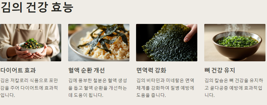 특히, 김은 오메가-3 지방산이 풍부하여 심혈관 건강에도 좋습니다. 이러한 효능 덕분에 김은 건강식으로 많은 사랑을 받고 있습니다.