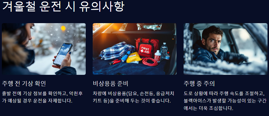 2. 비상용품 준비 : 차량에 비상용품(담요, 손전등, 응급처치 키트 등)을 준비해 두는 것이 좋습니다.