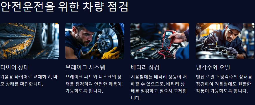 - 타이어 상태 : 겨울용 타이어로 교체하고, 마모 상태를 확인합니다.
