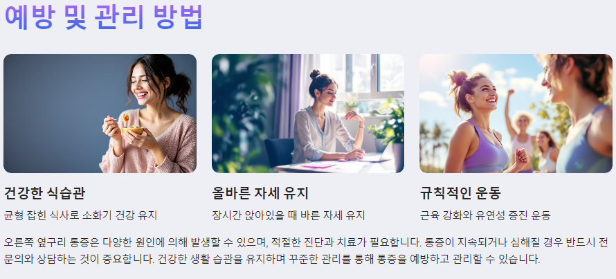 오른쪽 옆구리 통증을 예방하기 위해서는 다음과 같은 방법을 고려할 수 있습니다: